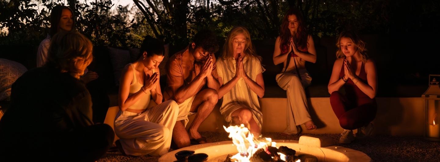A group of people gathered around a fire pit during a Spiritual Detox Retreat, sharing stories and enjoying the warmth.